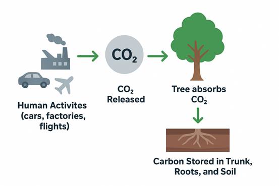 Trees are nature’s carbon machines. Through photosynthesis, they absorb CO₂ from the air and lock it into their wood, leaves, and soil.