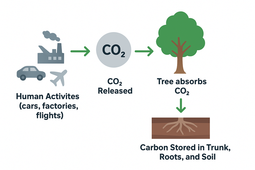 Trees are nature’s carbon machines. Through photosynthesis, they absorb CO₂ from